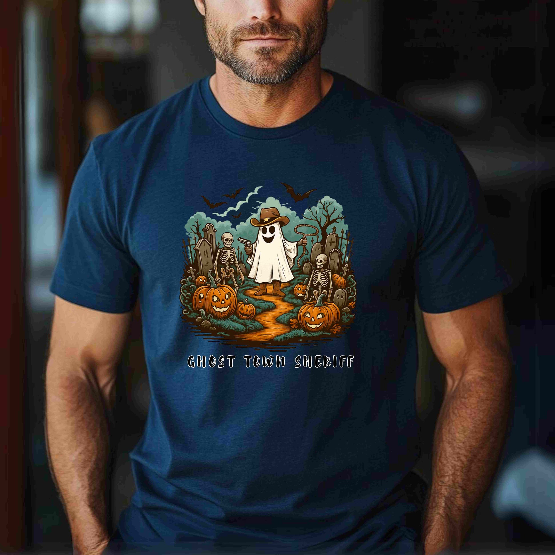Step into the Halloween spirit with the Ghost Town Sheriff T-Shirt, blending spooky charm and rugged style. Featuring a bold sheriff-themed design, this shirt adds a thrilling edge to your festive wardrobe. Perfect for parties or casual wear, its comfortable fit lets you celebrate in ease while standing out in the crowd. Make your Halloween memorable with this unique, eye-catching tee.